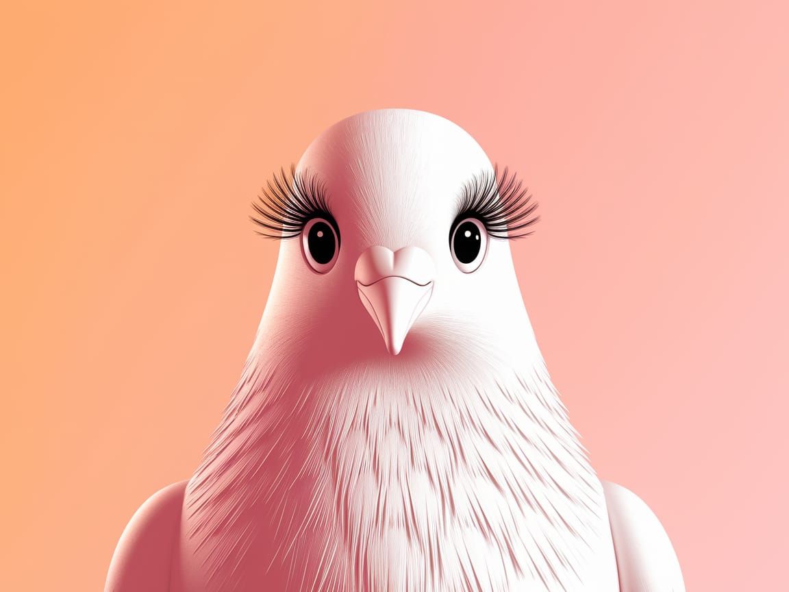 This image shows a beautifully rendered close-up of a stylized white pigeon with striking eyelashes, set against a soft peach background. The result is a delicate and whimsical portrait with a touch of surrealism.