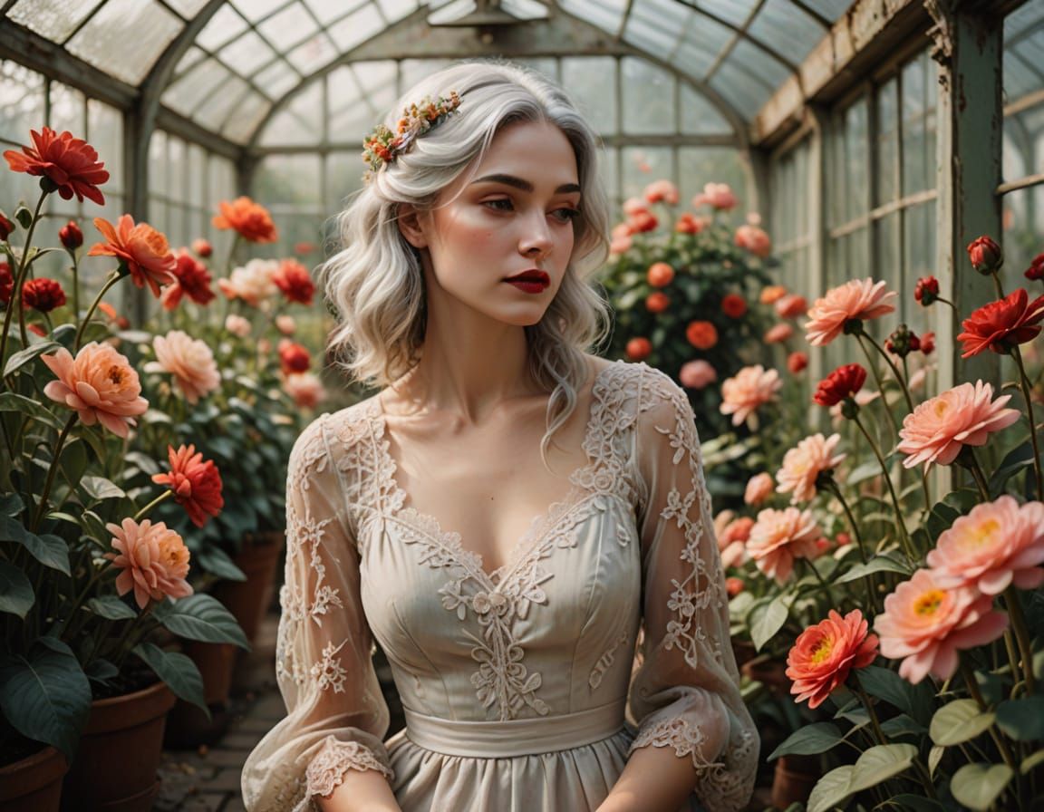 This image shows a young woman with silver hair in a loose style, surrounded by blooming flowers in a serene greenhouse setting, painted in an impressionist style with soft, warm light and delicate textures.