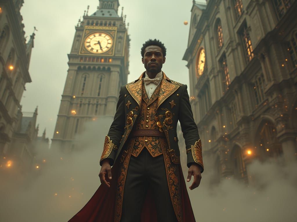 A majestic African American timekeeper in Victorian steampunk attire stands amidst swirling mist. Ethereal clockwork mechanisms float around him, with a towering clock tower rising in the background in hyper-realistic detail.