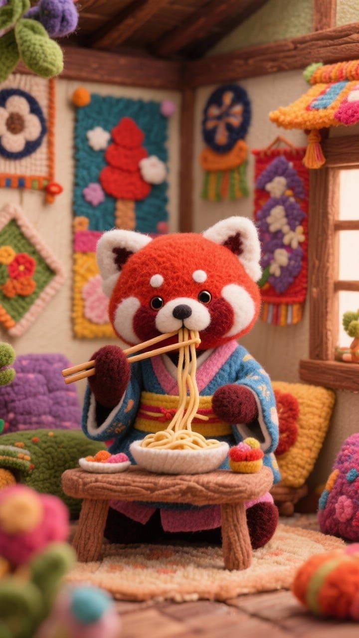 This image features a charming red panda crafted from felt, dressed in traditional Japanese garments and eating noodles. The scene is set in a cozy felt house adorned with intricate wall hangings, evoking a whimsical, handcrafted aesthetic.