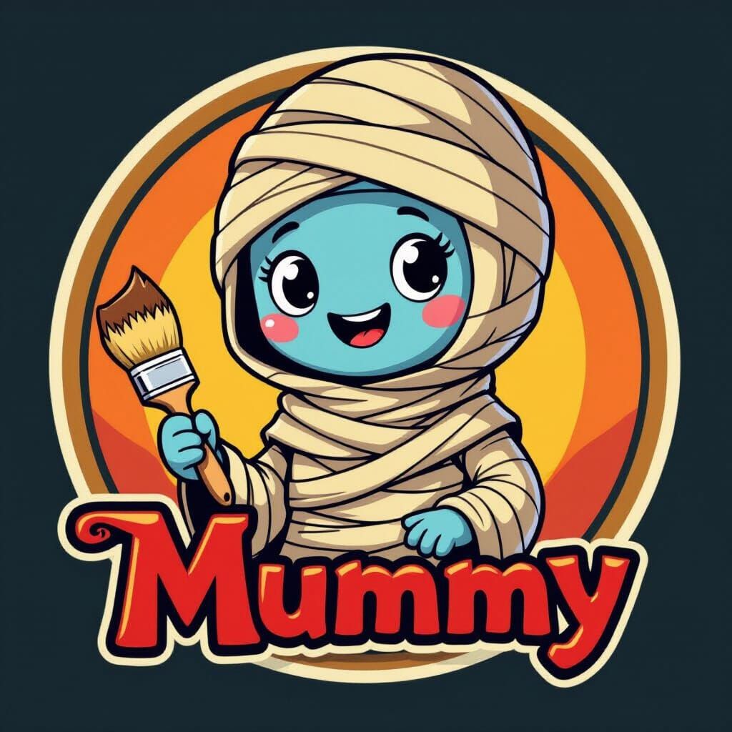 A smiling mummy character in a circular logo, holding a paintbrush. Features vibrant colors and playful lines reminiscent of popular animation styles.