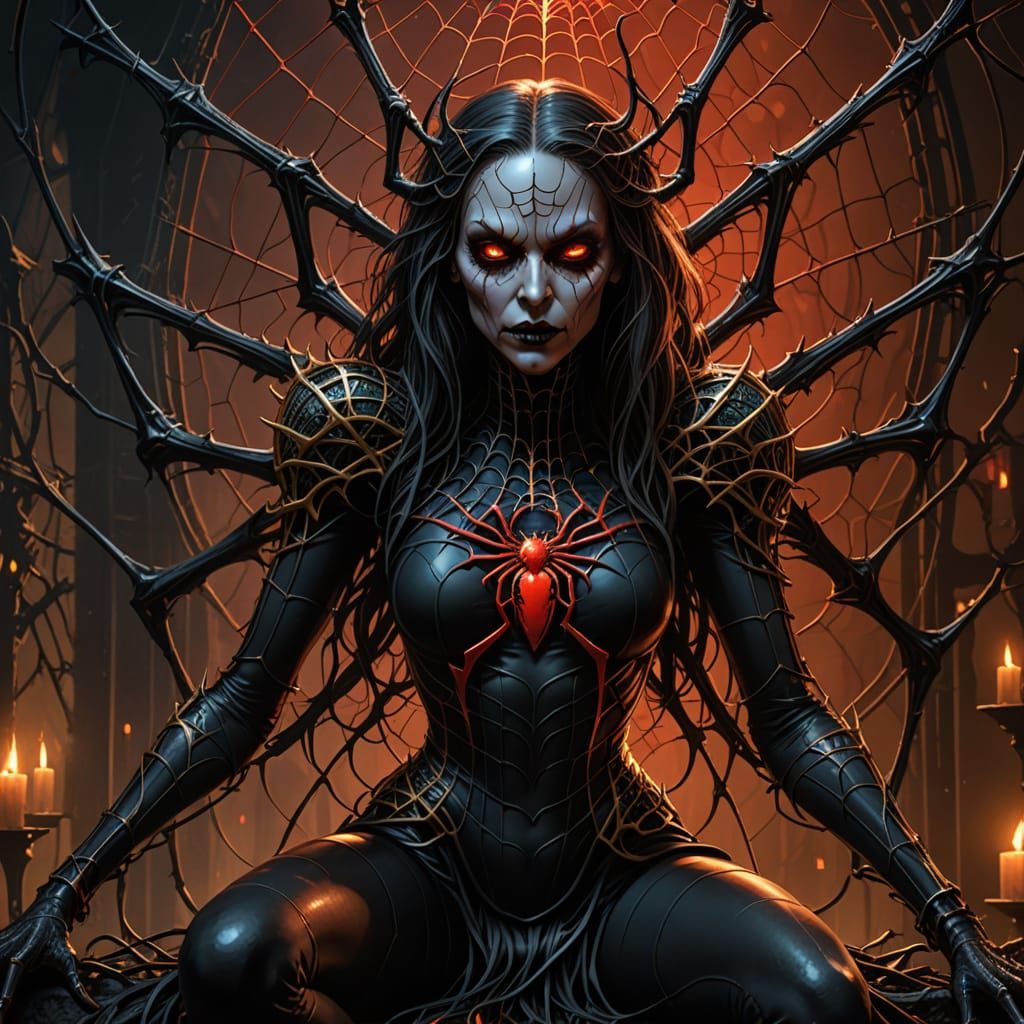A haunting 3D rendering of Lolth, the spider queen, enthroned in a web of human remains, surrounded by gothic architecture and ominous golden light, with intricate details and a mesmerizing gaze.