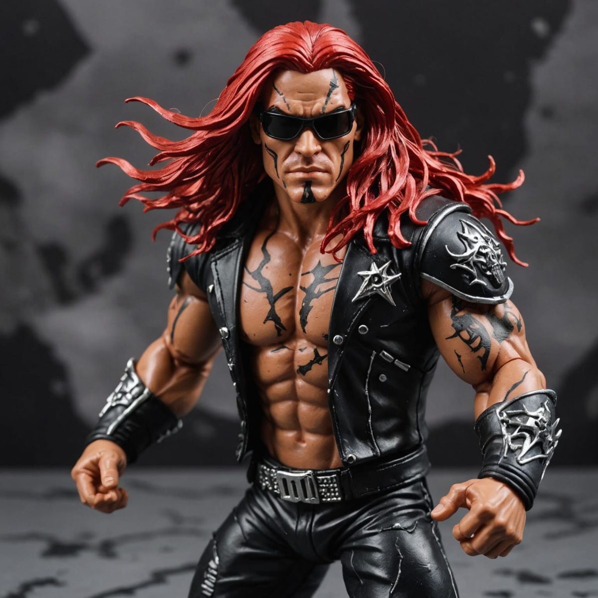 This image depicts a male wrestler action figure with striking red hair and intricate demonic tattoos, posed in a dynamic battle stance, amidst a dark and ominous background, evoking a heavy metal aesthetic