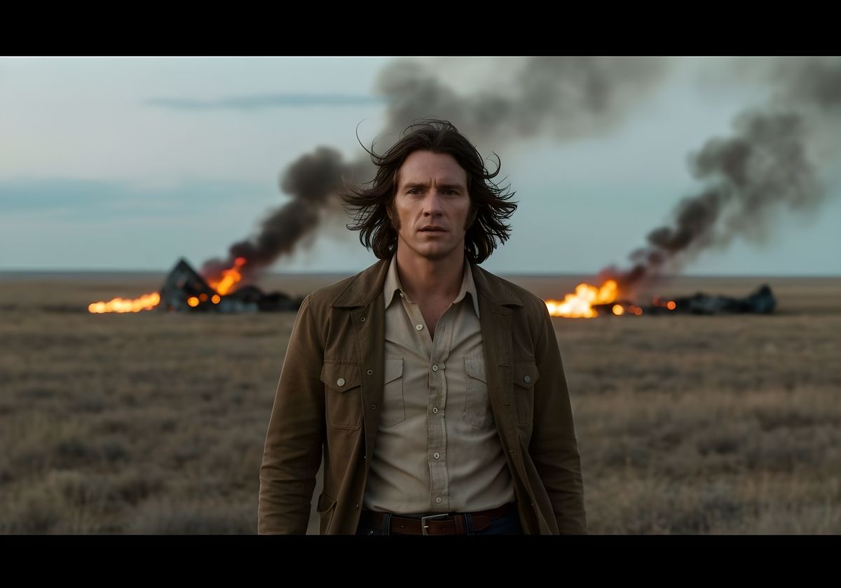This image shows a mid-shot of a menacing character with long hair and an intense look, wearing 1970s clothing. The background is a desolate prairie with burning wreckage in black and white.