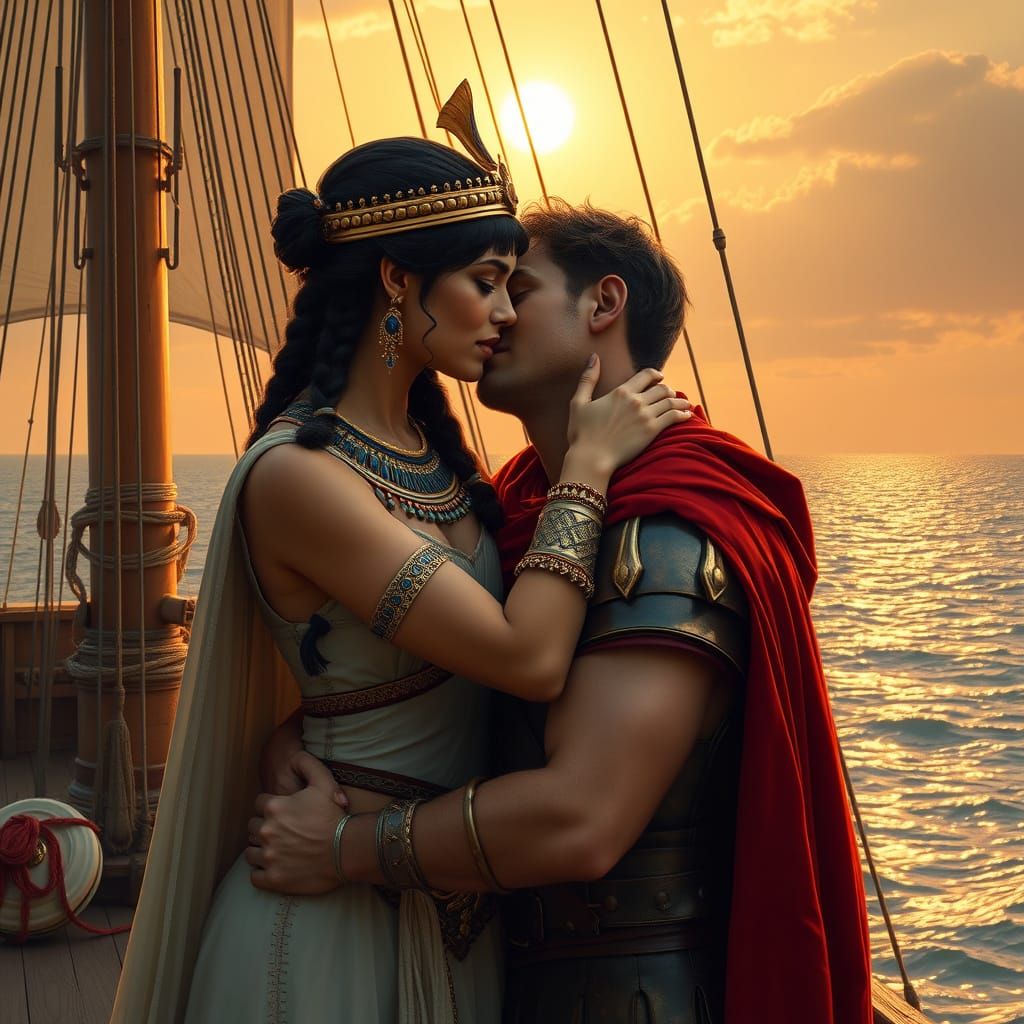 A beautiful depiction of an Egyptian queen's tender kiss to her Roman soldier husband on a sailship, set against a warm golden sunset backdrop, blending ancient elegance with romantic intimacy