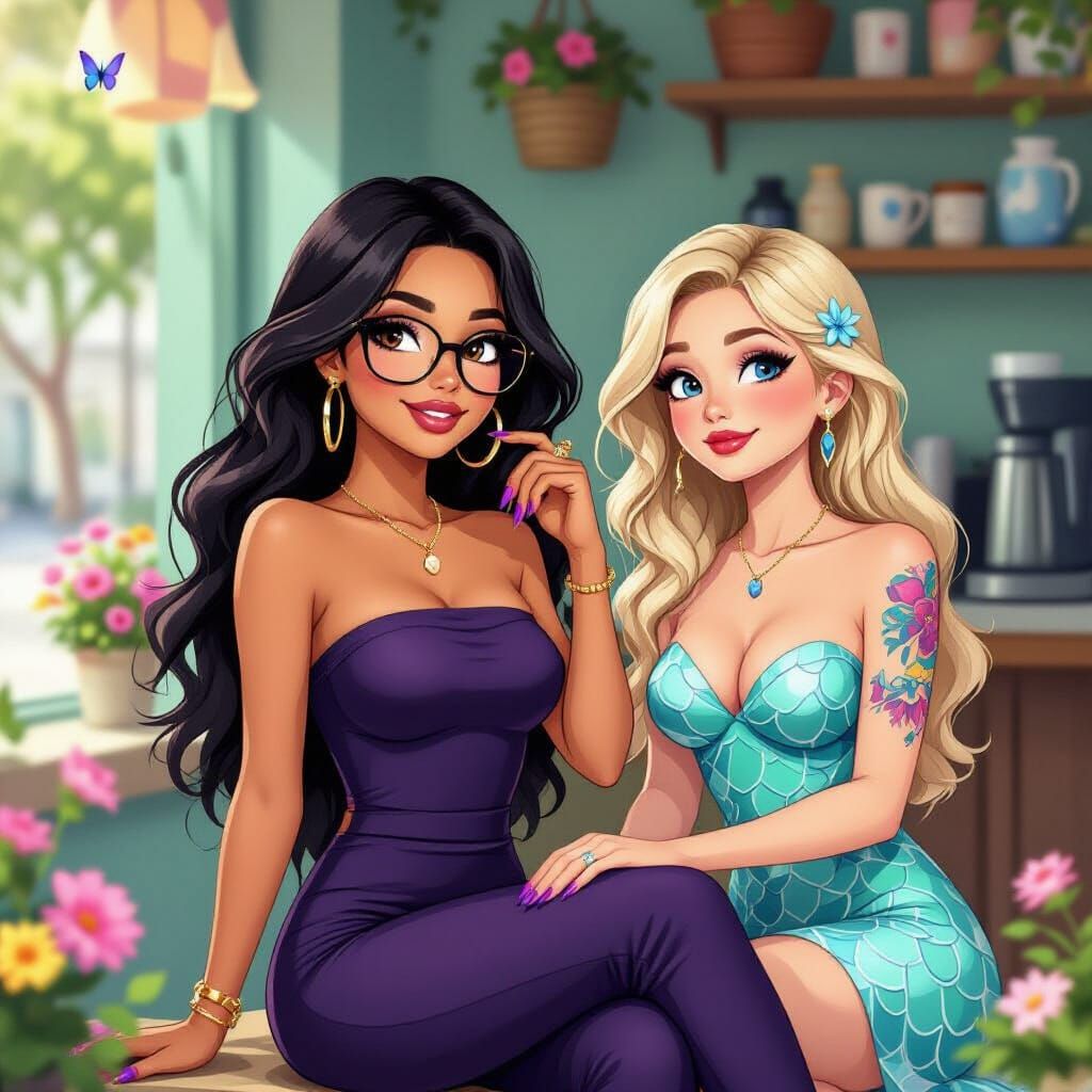 A digital illustration of two stylish women outside a quaint coffee shop on a sunny day. The image uses a whimsical, colorful style with elements of fantasy and nature.