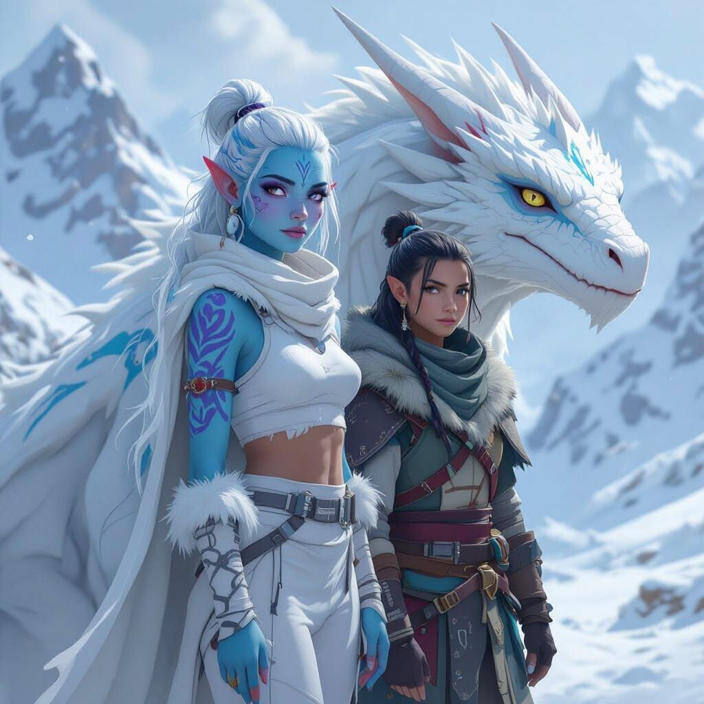 This image shows a tall, curvy Na'vi girl with pastel blue skin and a white dragon companion in a snowy mountain setting. The artwork has a digital painting and concept art style, with soft, ethereal lighting.