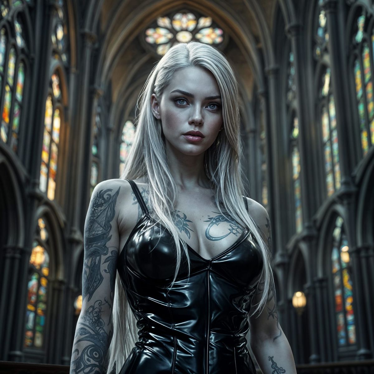 A striking picture of a tattooed woman with silver skin and white hair in a gothic cathedral. She's wearing a black latex suit and bathed in ethereal light, rendered with hyperdetailed textures and dynamic lighting.