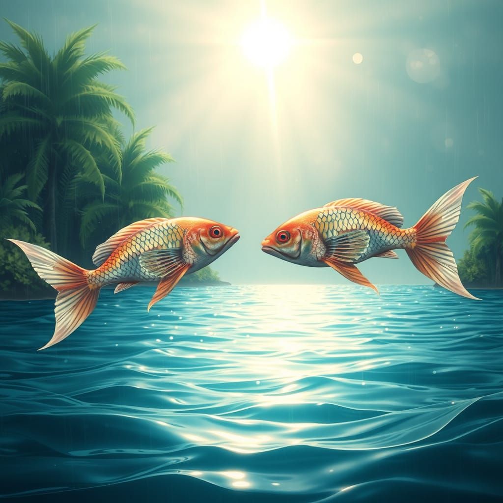 This image shows delicate, iridescent fish leaping from the ocean in a serene tropical storm, surrounded by lush greenery and soft pastel colors, capturing the dreamy essence of zodiac concept art