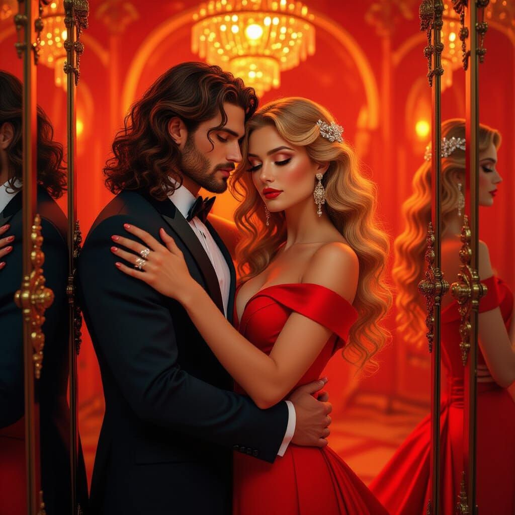 A vibrant image showcases a blonde woman in a red dress embracing a man in a mirrored room. The artwork features fiery hues and psychedelic elements, rendered with intricate details and textures.