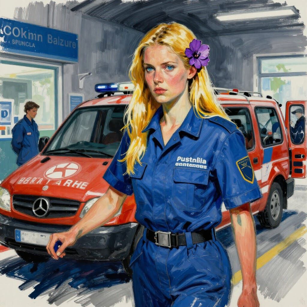 This image depicts a dedicated paramedic at a medical center during an emergency, rendered with bold charcoal strokes and dramatic lighting. The expressive style captures the urgency of the scene.