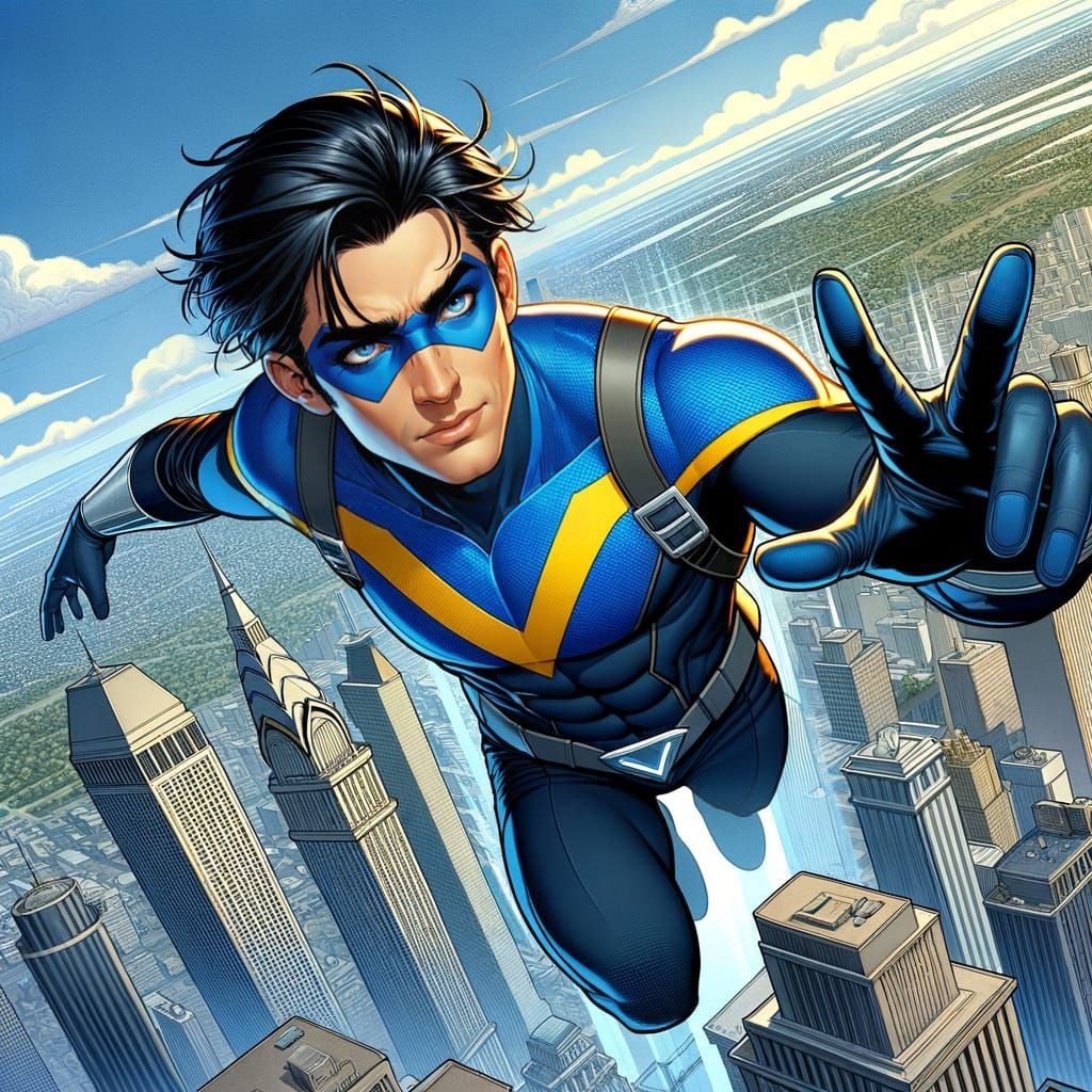 This vibrant comic book image features a young adult superhero floating above a bustling city in a blue costume with a yellow 'V' emblem, showcasing a sense of smooth perfection and dynamic lines.