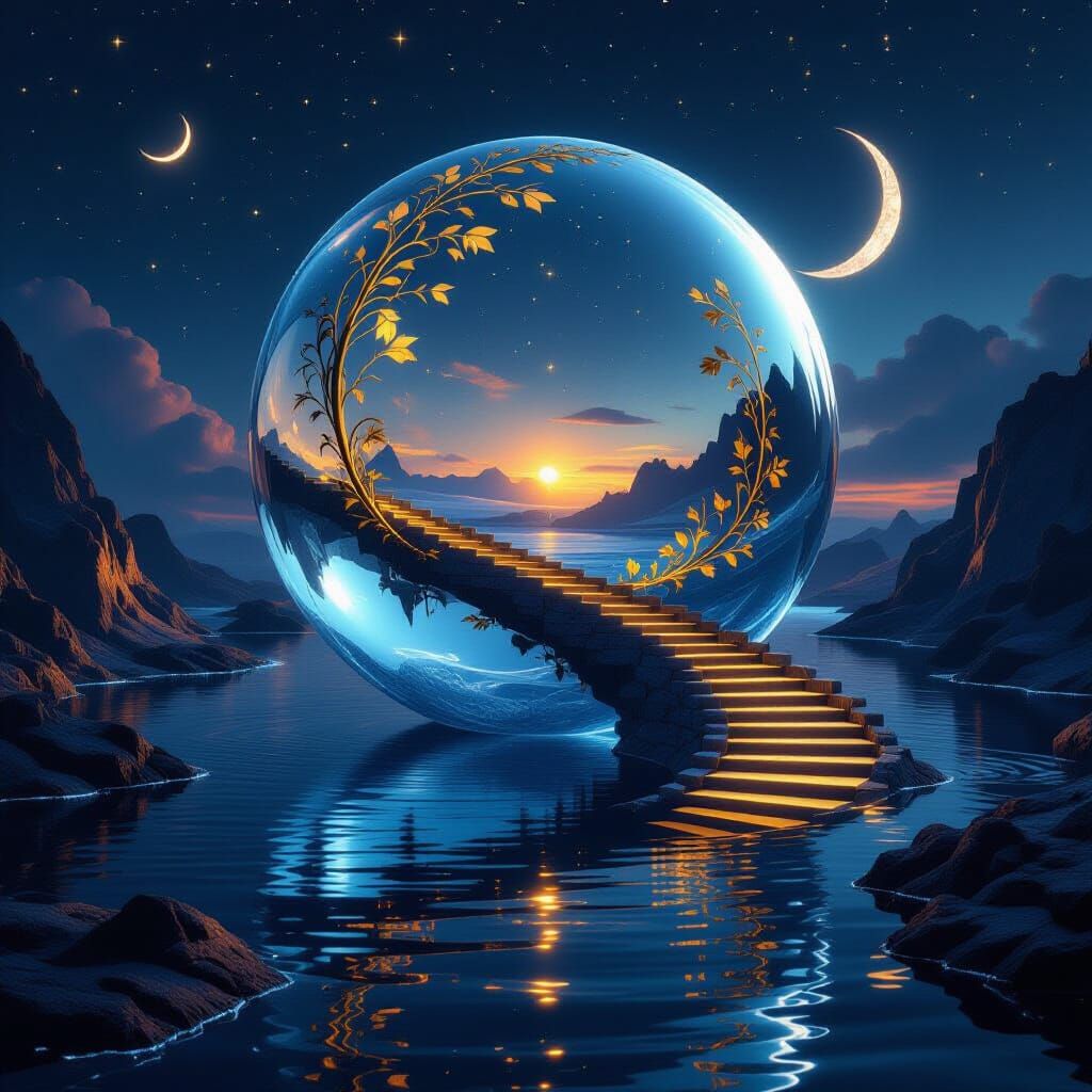 A striking picture of a canyon inside a transparent sphere floating above a dark sea. Golden vines spiral around the sphere, with staircases and a bridge leading to the canyon in this hyperrealistic digital artwork.