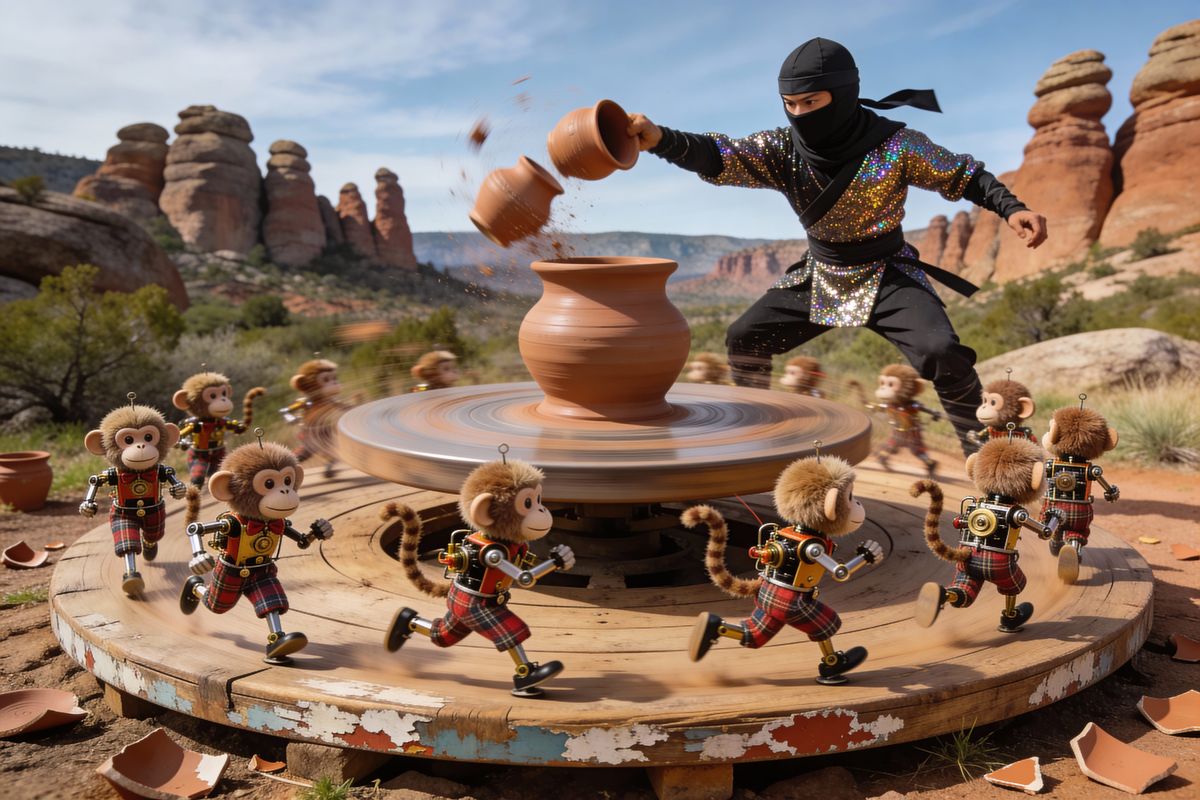 classic of timeworn performance pottery featuring a glitterninja throwing pots onto a giant floating pottery wheel being spun by 14 fluffy clockwork monkeys in tartan jodhpurs skipping around a wooden turntable in situ Chiricahua bold natural lighting