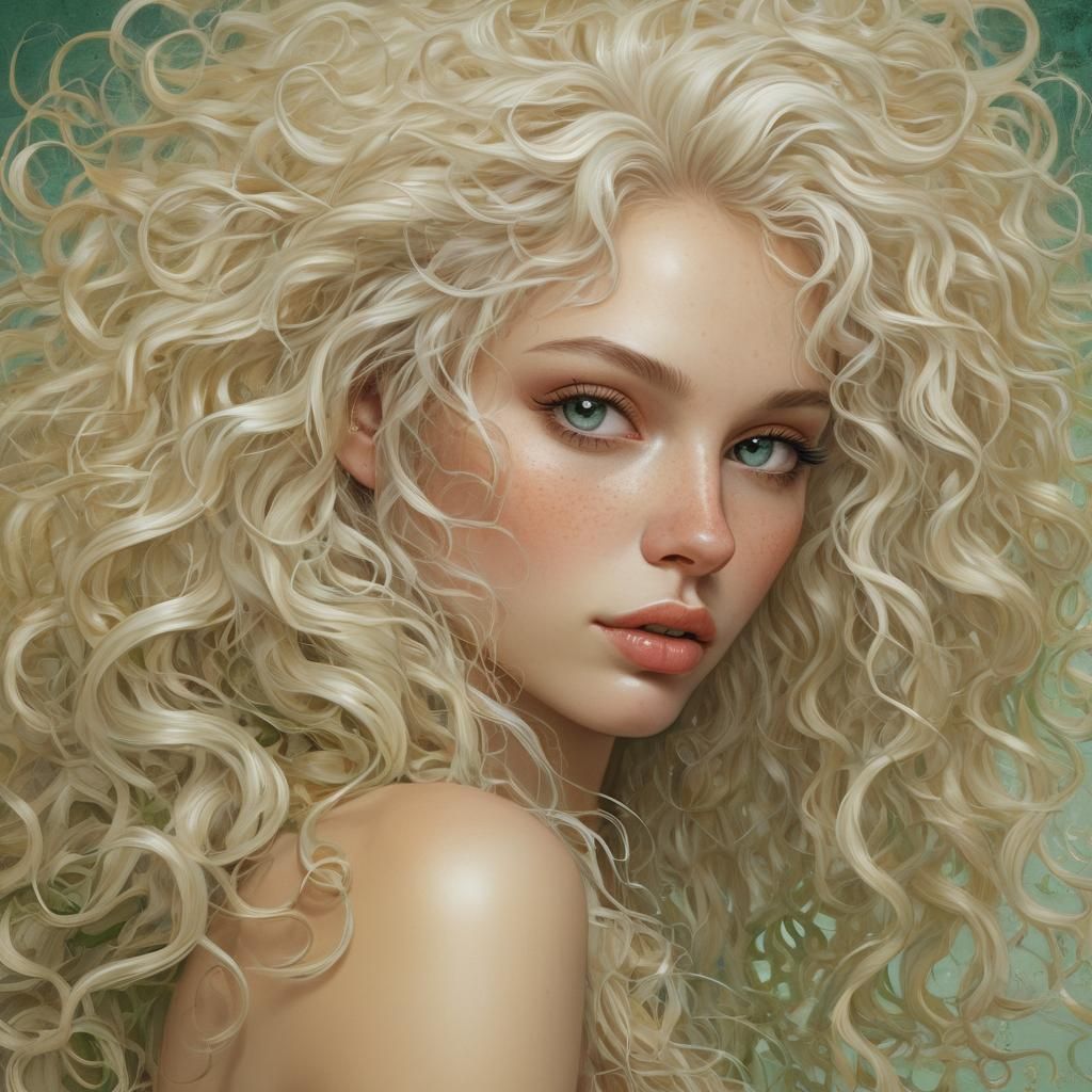 A digital illustration of a beautiful young woman with fair skin and voluminous platinum blonde hair. She has large green eyes and wears an elaborate metallic and gold outfit in a whimsical fantasy style.