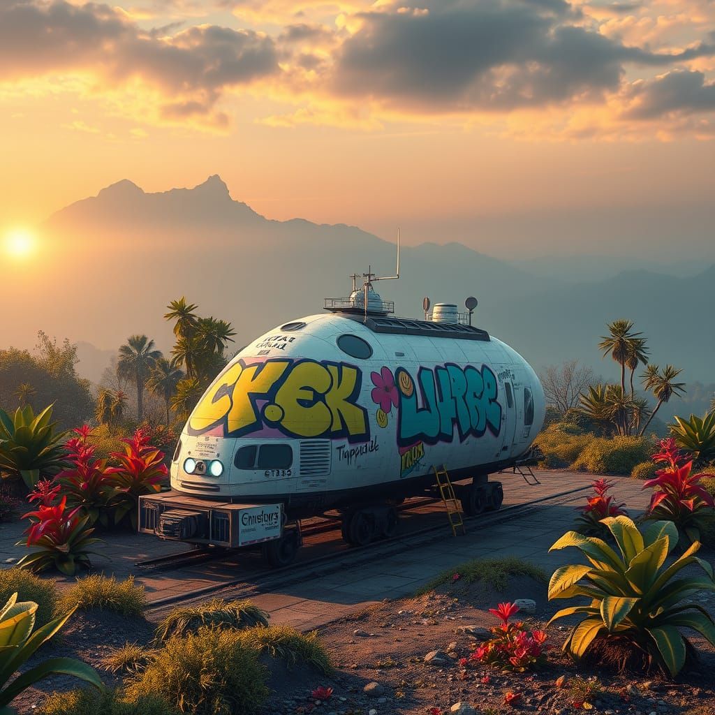 This stunning image captures a colorful spacecraft amidst a lush jungle launchpad, surrounded by exotic plants and blooming flowers, bathed in soft, golden morning light, with hyperrealistic details and textures, reminiscent of futuristic art styles.