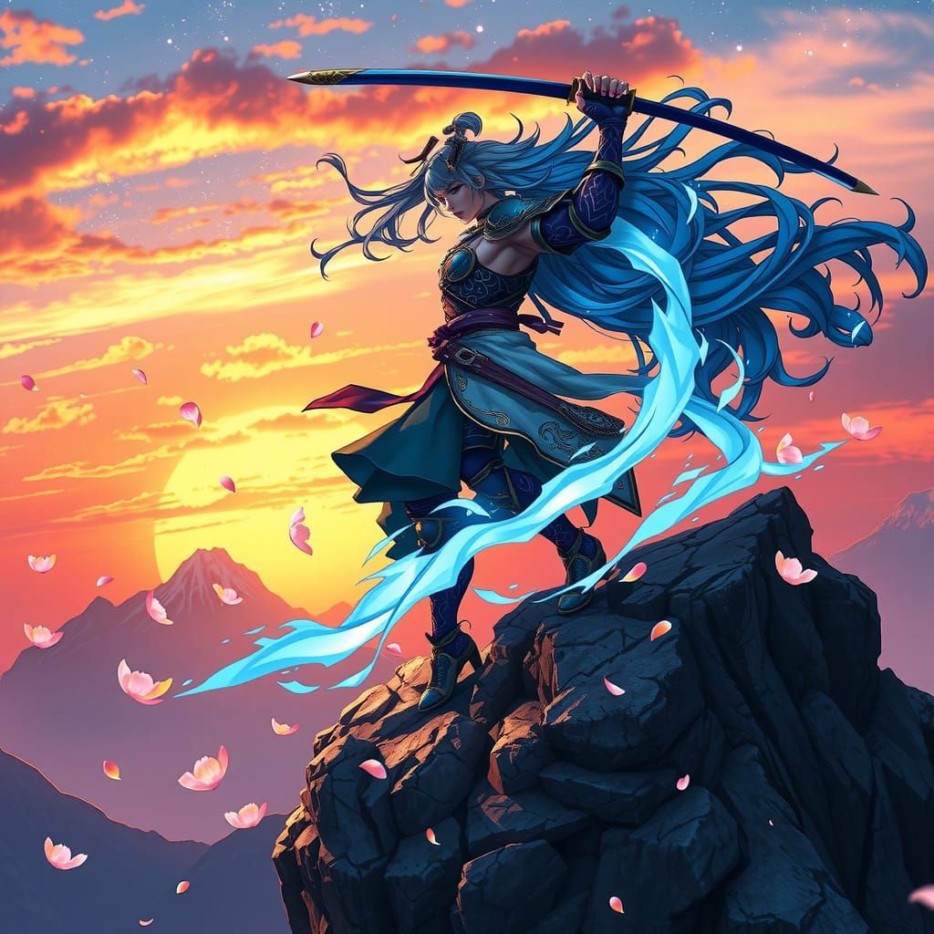 A powerful warrior stands on a cliff with katana raised as blue energy flows through them. Cherry blossom petals float in the air, set against a vibrant sunset sky in a detailed digital art style.