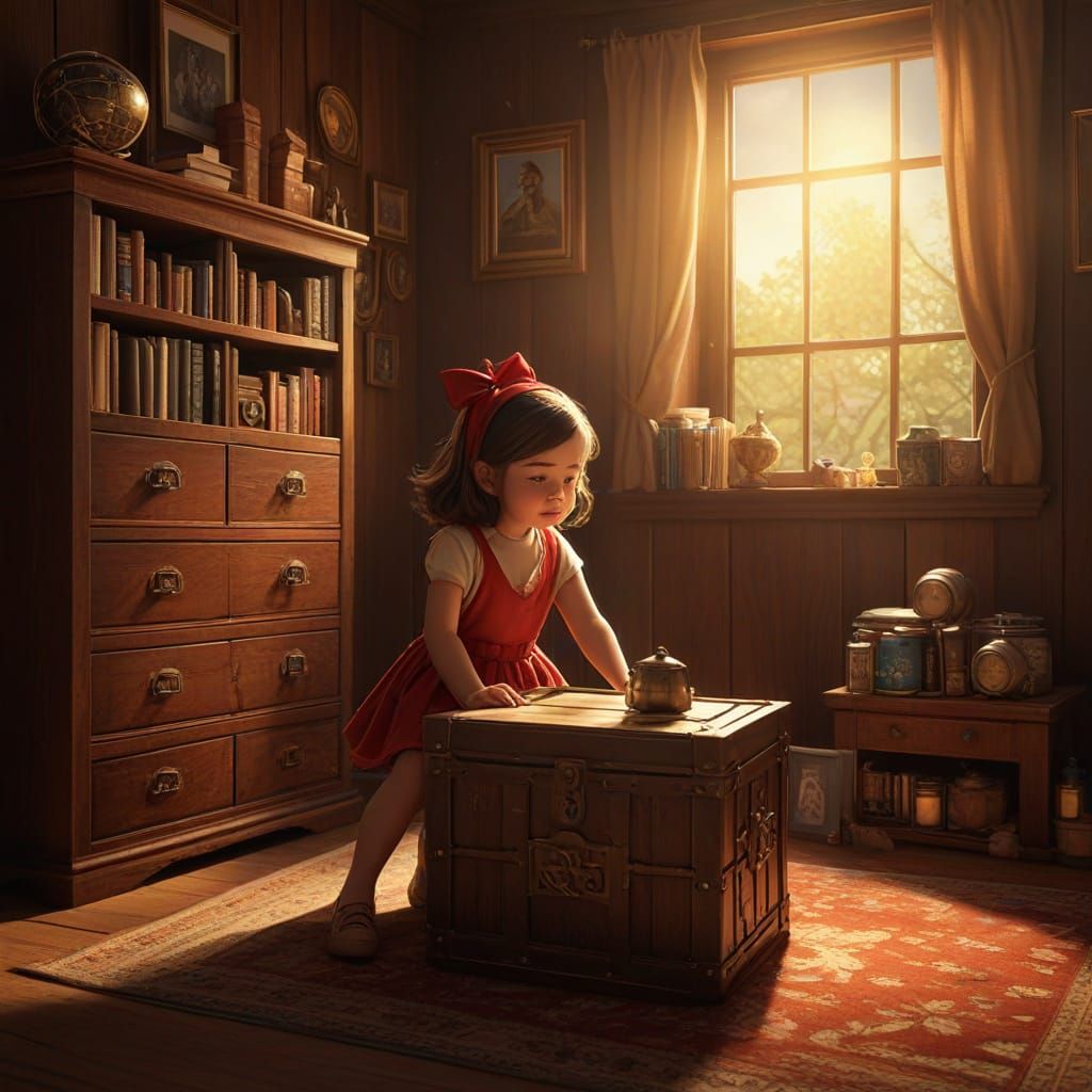 A little girl in high-heels and a red bow on her head intensely studies a wooden chest filled with treasures in a warm, golden-lit room with rich textures and vibrant colors, set against a bright, whimsical background.