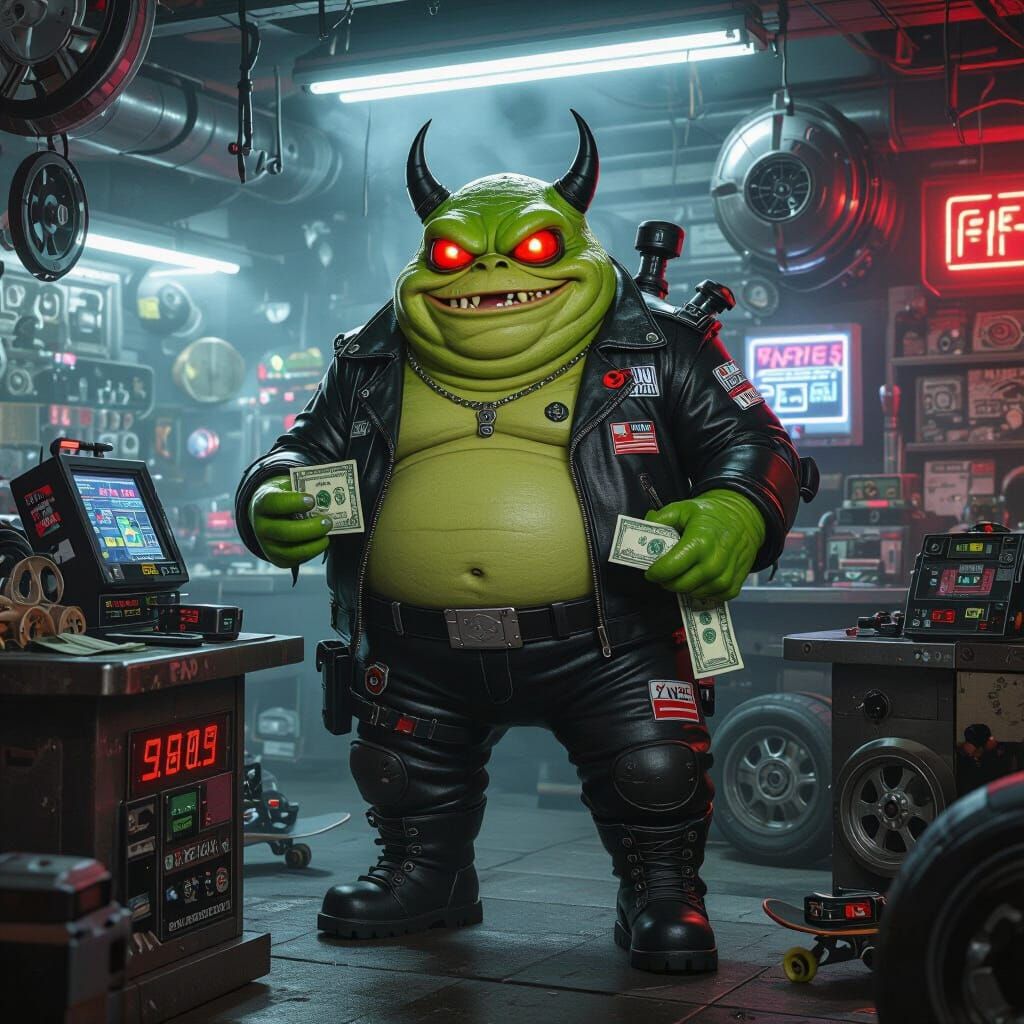 A digital image of a Slimer-like creature in a sci-fi auto parts store. The character, reminiscent of Jabba, is dressed in leather and surrounded by advanced tech, engines, and skateboarding gear in a cyberpunk aesthetic.