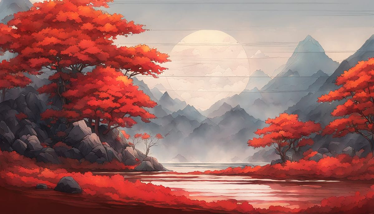 This image shows a zen garden focused on balance and harmony. A vibrant red maple tree stands in contrast to the muted sand, rendered as digital painting with ethereal lighting.