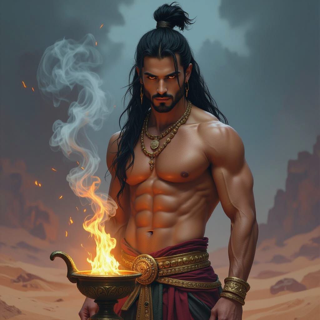 A hyperrealistic image of a muscular Arabian man with long hair, partially dissolving into smoke as he emerges from a lamp. Set against a dark, gothic desert landscape with vibrant color depth.