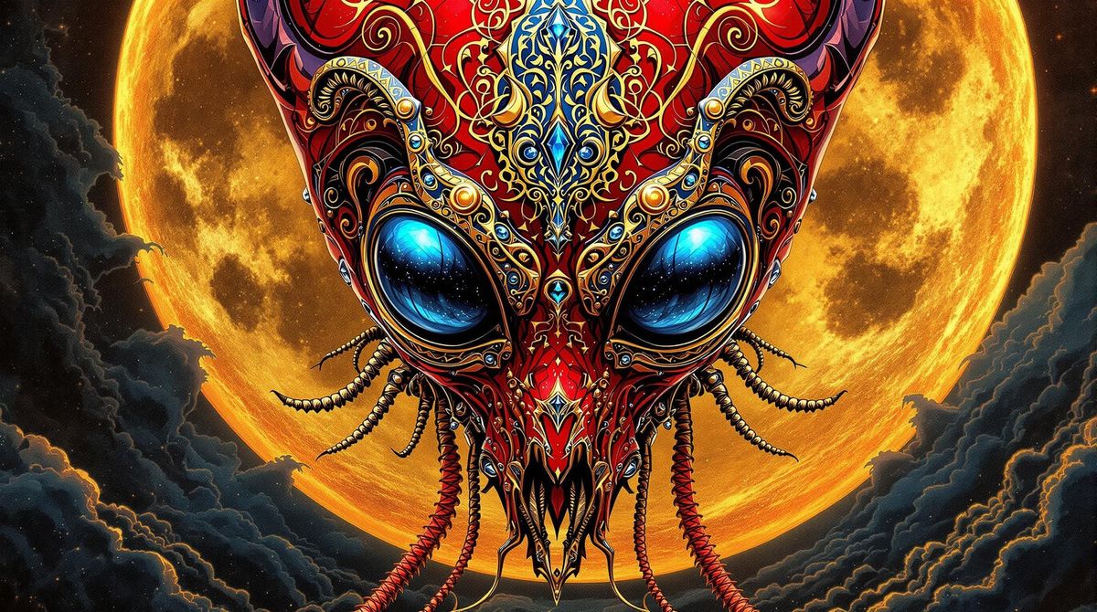 A majestic, insectoid alien head dominates the frame, its red skin glistening with golden filigree, surrounded by intricate, steampunk-inspired designs and a majestic, cratered moon in the background.