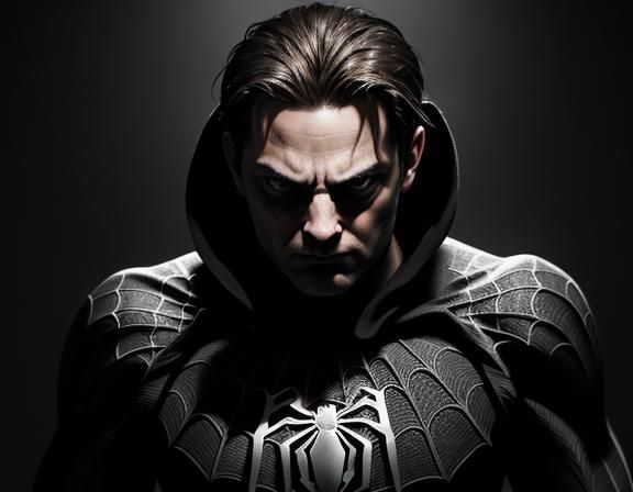 Color Photorealistic high 8K resolution. Deep saturation, high contrast. Dynamic angle. Tobey Maguire as 49 year-old-Spider-Man in action. Textures of skin, hair and clothes richly detailed. Moody shadows dance across their faces. (Incredibly detailed music stage texture background:1.3) (Masterful use ...