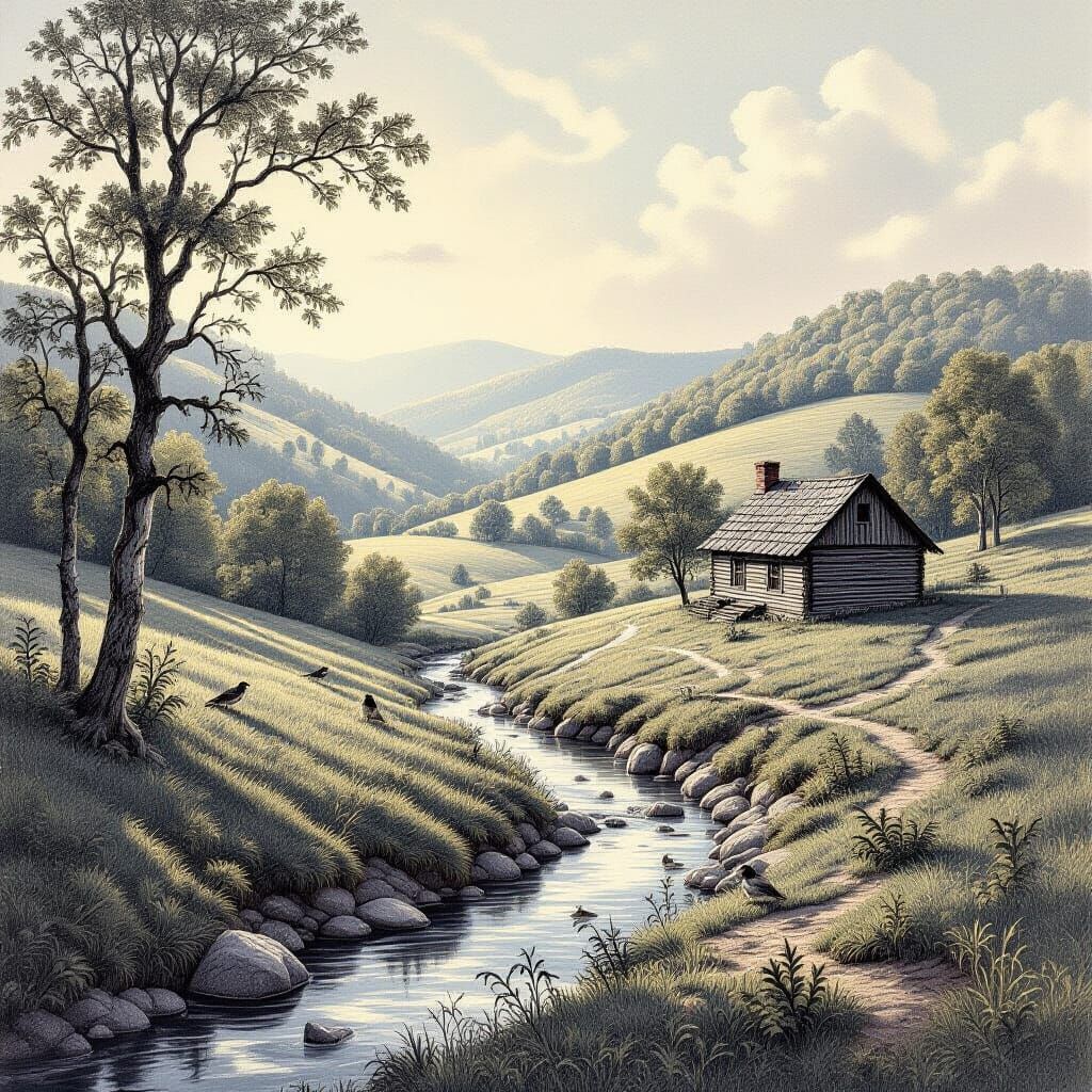 Easily generate your own pencil drawings of the beautiful Hills of Western Virginia. Free and simple AI art creation.