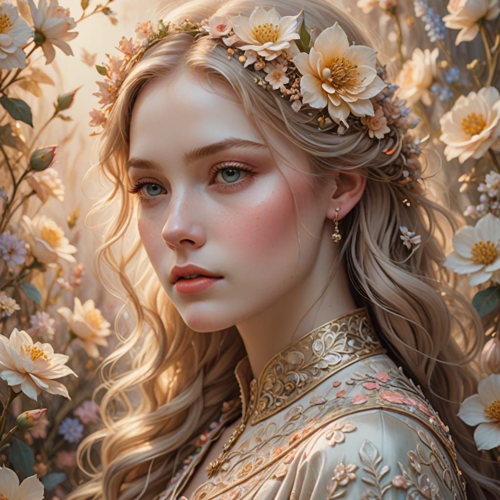 This ethereal fantasy art features a close-up of a young girl with a soft gaze. Delicate brushstrokes and soft colors highlight intricate floral details and golden hour lighting.