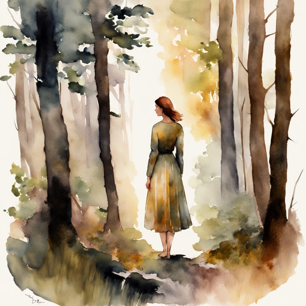 This image shows a woman standing in a forest. It's rendered in a watercolor style with earthy tones and soft brushstrokes, giving it a dreamy, impressionistic feel.