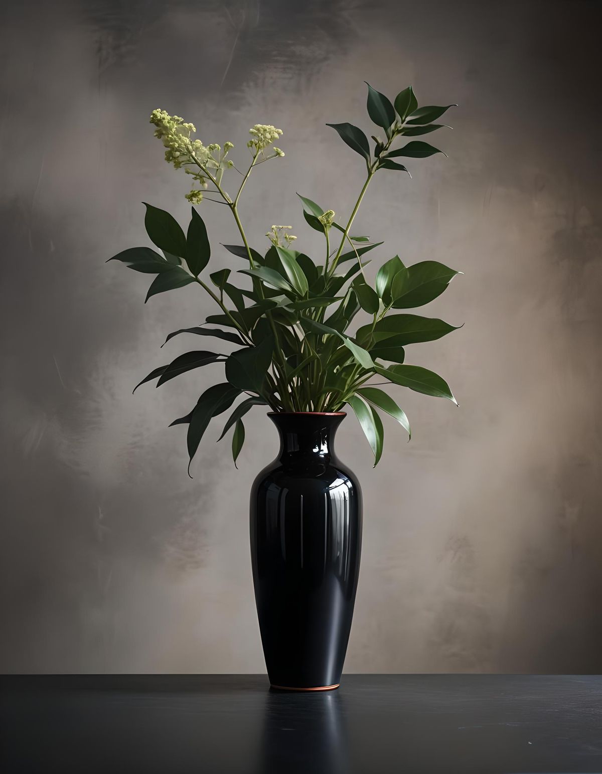 This image shows a vase shaped like a woman's face on a table against a dark backdrop. The vase holds a plant. Natural lighting and shallow depth of field create a professional photography style.