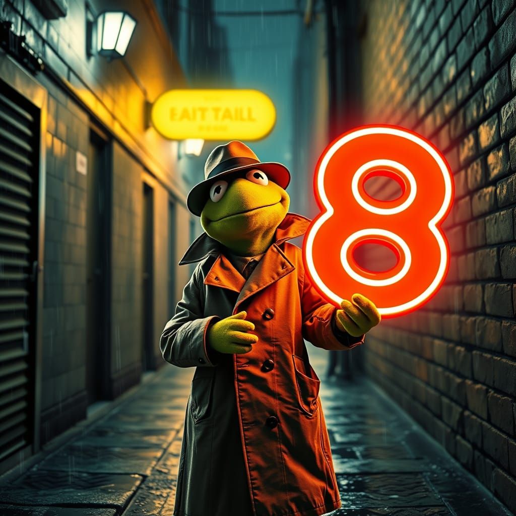 This image shows a Kermit-like muppet standing in a rainy alleyway, holding a large neon-lit number eight in a bold, cinematic style reminiscent of 1940s film noir and graphic novels.