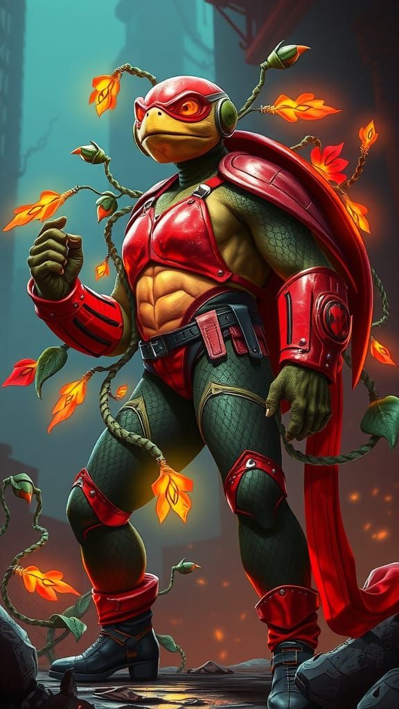 A hybrid creature with a turtle shell and red armor, entwined with glowing bioluminescent plants. Rendered in an Art Nouveau aesthetic with moody lighting, this image blends organic growth with urban decay.