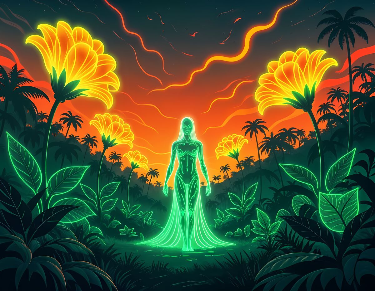 A surreal jungle where all vegetation glows in neon green, and the sky pulses with waves of neon orange light. Giant bioluminescent flowers sway as if dancing, and strange bird-like creatures leave orange streaks in the air. At the center, a luminous humanoid with translucent skin channels the energy ...
