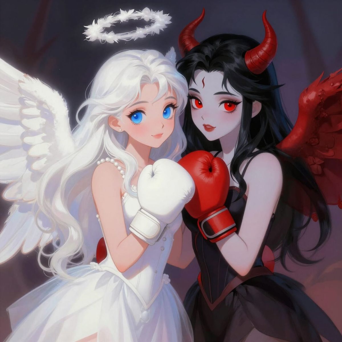 This image shows an angelic figure and a demoness in a sweet, harmonious embrace. Rendered in a soft, whimsical digital painting style with vibrant colors.