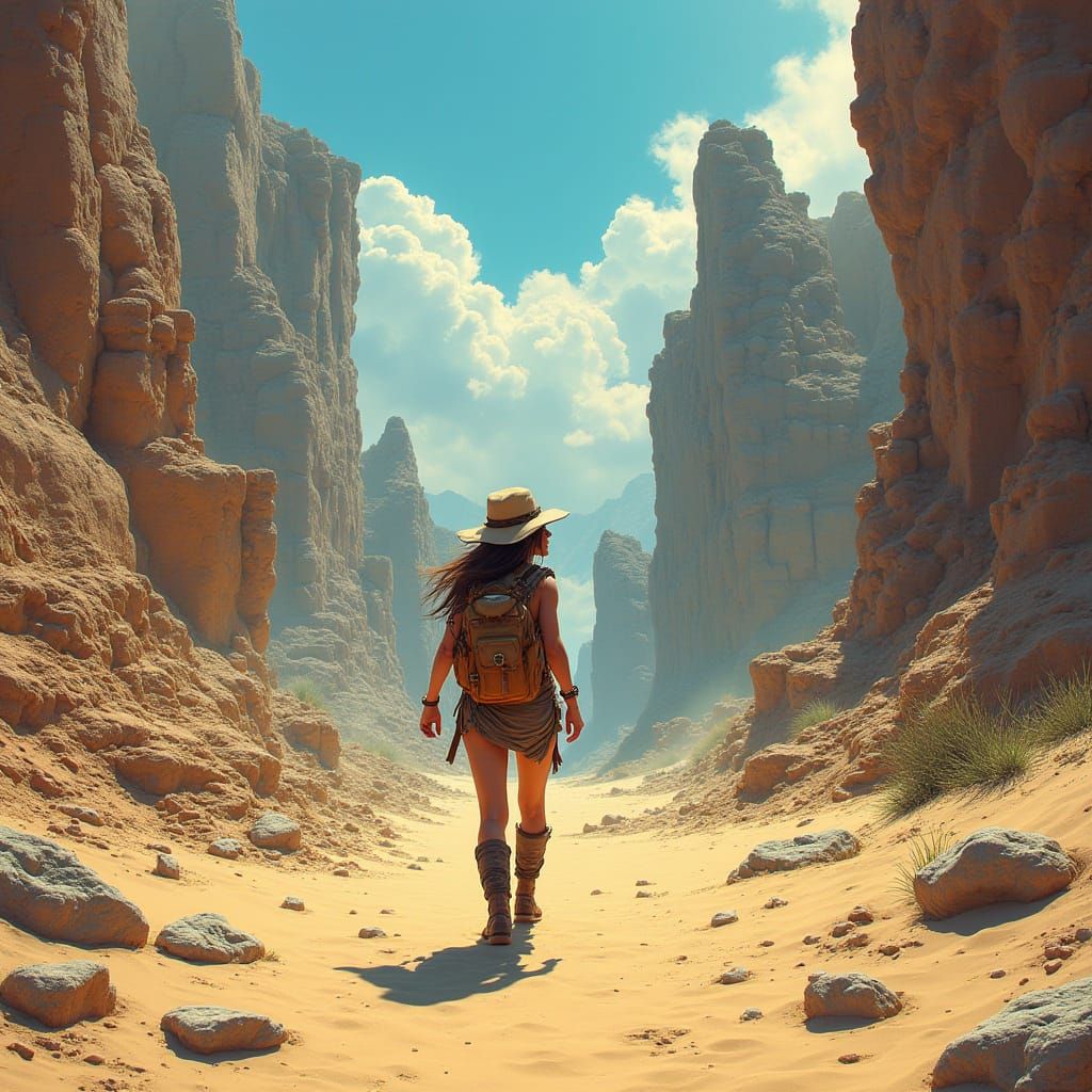 A vibrant image showing a young woman walking through the ruins of a lost city, partially buried in sand. The artwork is reminiscent of a detailed comic book illustration.
