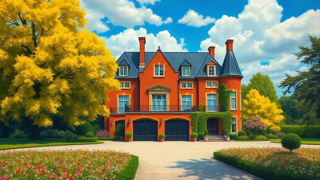 This image shows a stately brick chateau with an attached garage, surrounded by colorful trees and a flower garden. The scene features a bright blue sky with clouds, rendered with visible brushwork and rich textures.