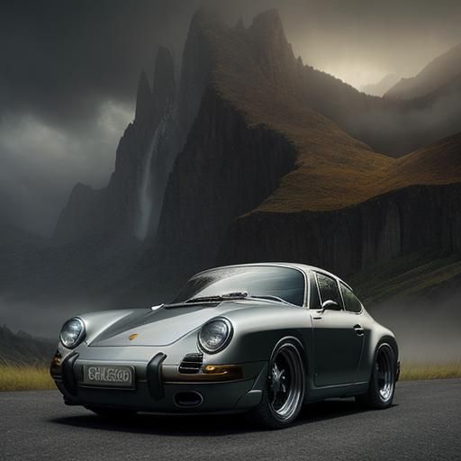This image showcases a vintage Porsche in a dramatic and cinematic style. The digital matte painting features intricate details and an atmospheric quality.