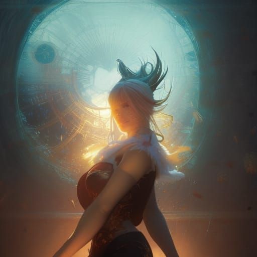 A digital rendering of Elizabeth Liones from Nanatsu no Taizai. The image features dynamic lighting, intricate details, and volumetric lighting in an orange and teal color palette, reminiscent of art nouveau.