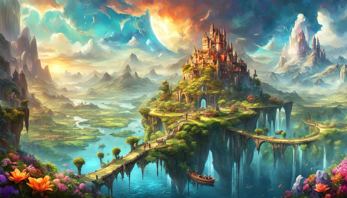 This image depicts a highly detailed, colorful utopia featuring floating islands, castles, villages, a river, and mountains. It showcases lush vegetation and ethereal architecture in a widescreen cinematic view, rendered as digital art.