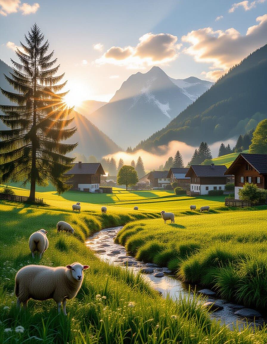 This image shows a hyper-detailed, serene Swiss village at dawn. Experience a golden sunrise over lush fields, misty mountains, and a reflective stream, rendered with cinematic realism and vibrant natural lighting.