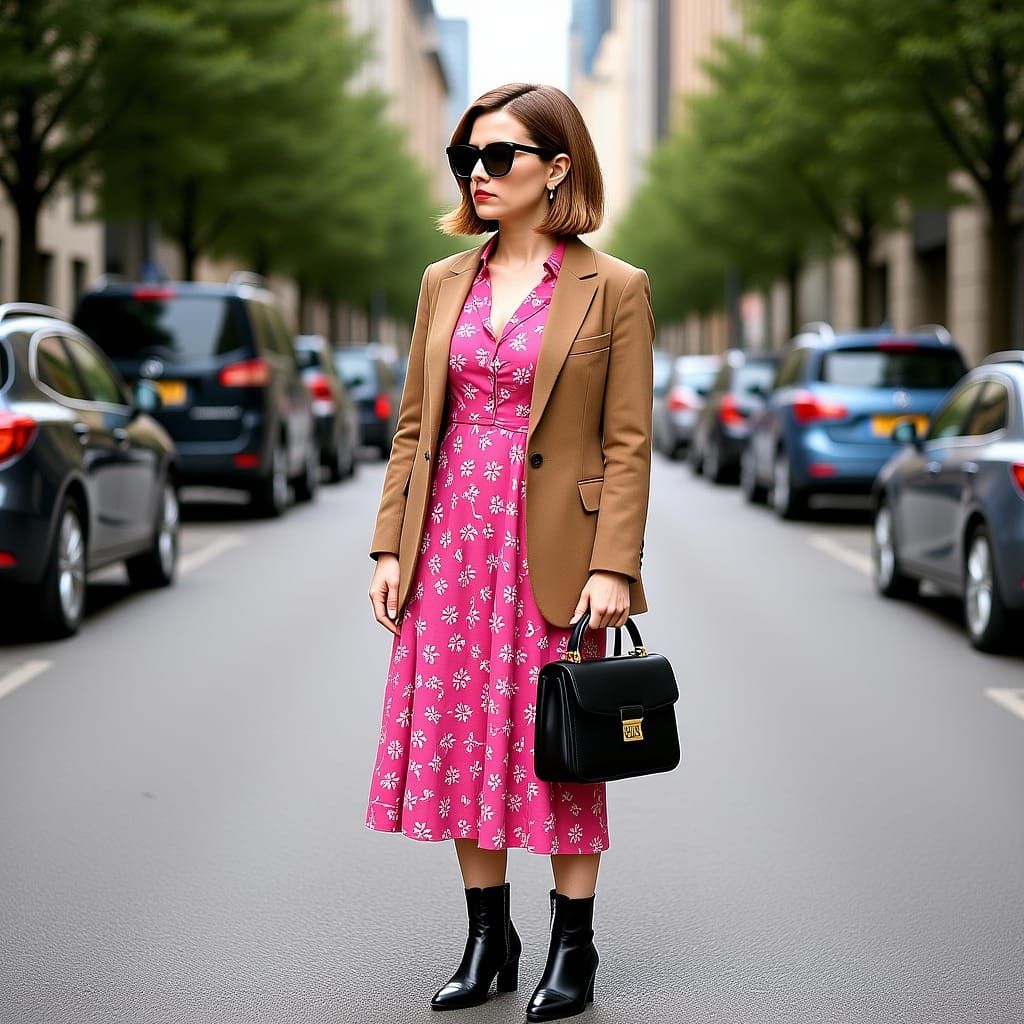 This image shows a fashionable woman on a city street. She wears a floral dress, blazer, and boots, accessorized with sunglasses and a handbag. The scene conveys a sense of urban style.