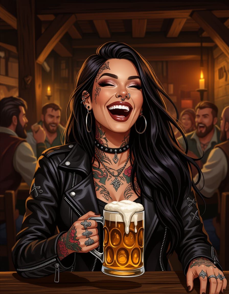 This image shows a tattooed woman with long hair laughing in a tavern. She's wearing a leather jacket and holding a tankard, in a detailed portrait with gothic and punk influences.