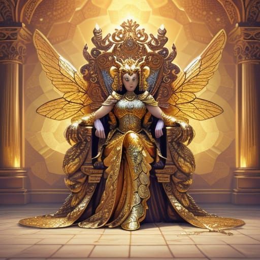 A digital painting of a giant honey bee dressed as a goddess sitting on a throne. This fantasy art piece features golden honeycomb patterns, iridescent wings, and soft, warm lighting.