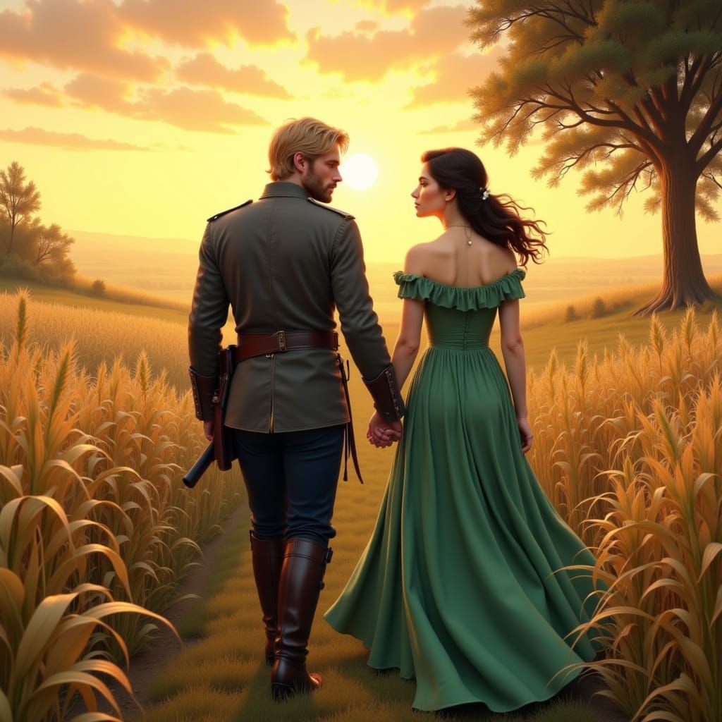 A vivid image shows Scarlett O'Hara and Ashley Wilkes walking together through fields at sunset. Warm light bathes the scene, in a photorealistic style reminiscent of golden age illustrations.