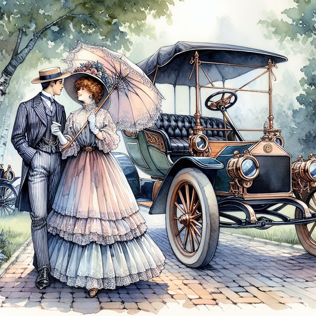 This image shows a smartly dressed couple in vintage clothing standing next to an early 20th-century Oldsmobile. The scene is rendered in soft watercolor style with delicate pastel hues, like a vintage storybook illustration.