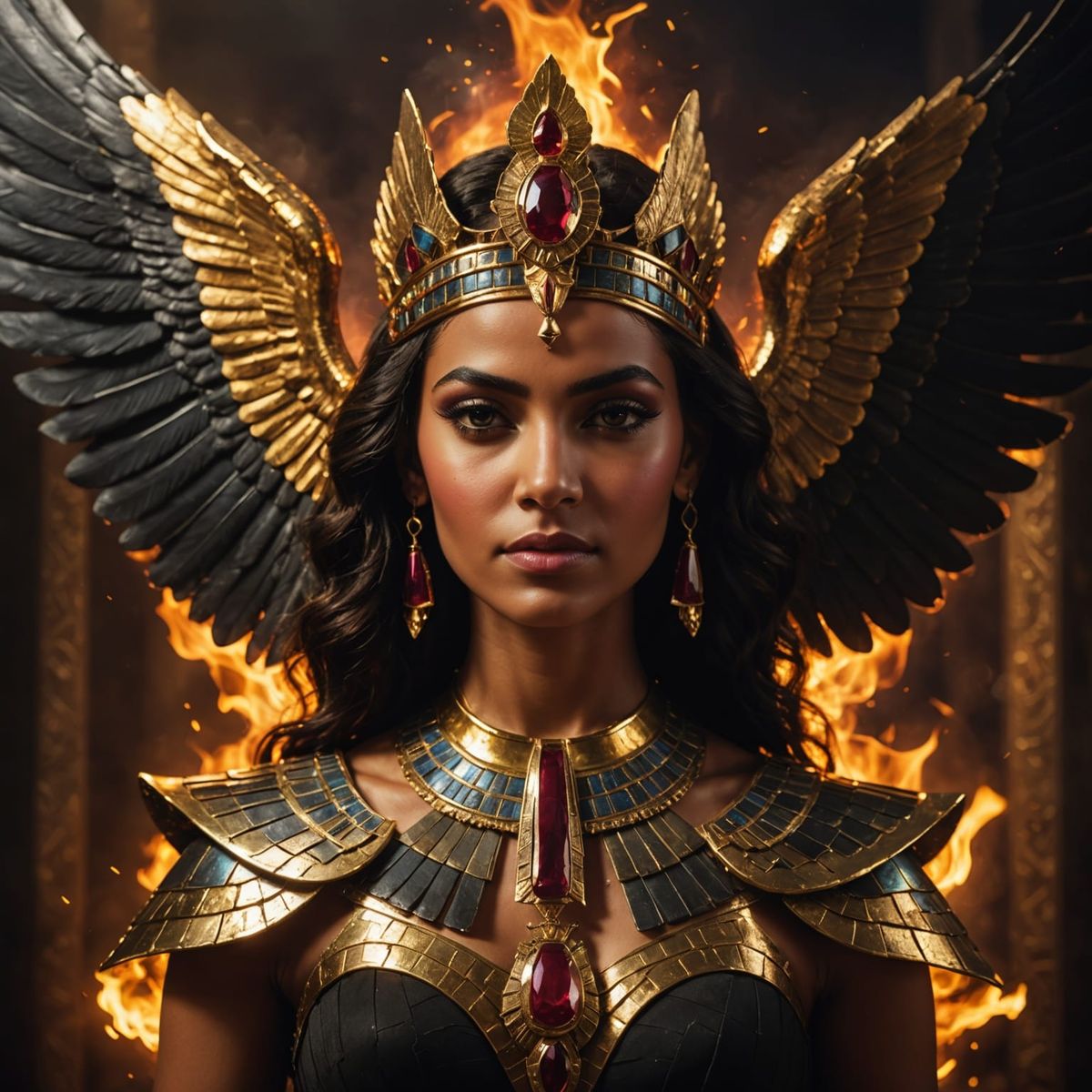 A hyper-realistic portrait of an Egyptian queen adorned with a dramatic tiara of molten gold and ruby, inspired by mythological wings, set against cinematic lighting.