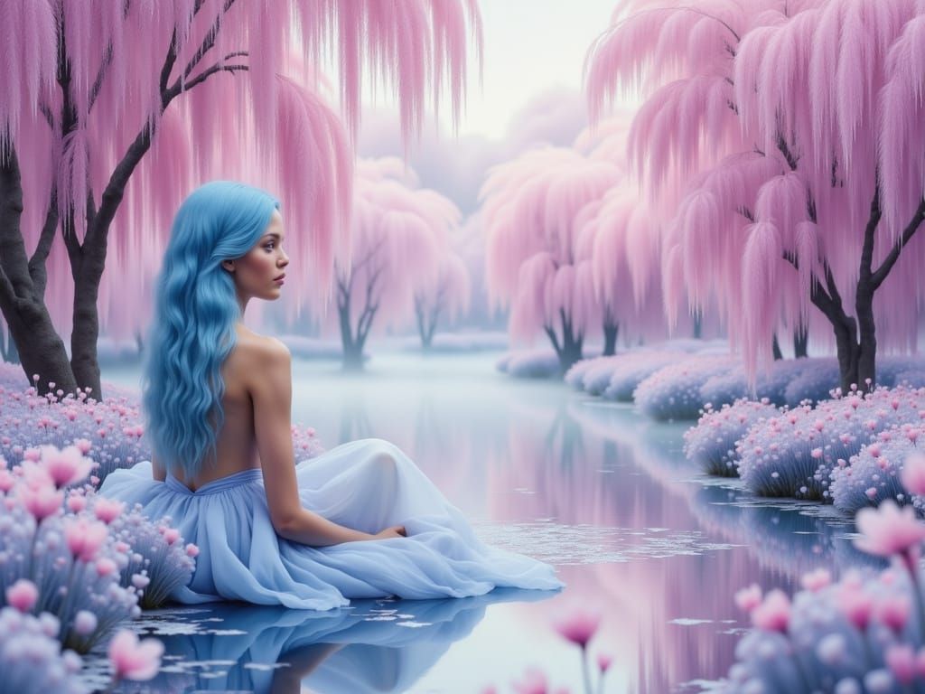 Generate your own fantasy lake scenes with nymphs and pink willows. Free and easy AI image creation.