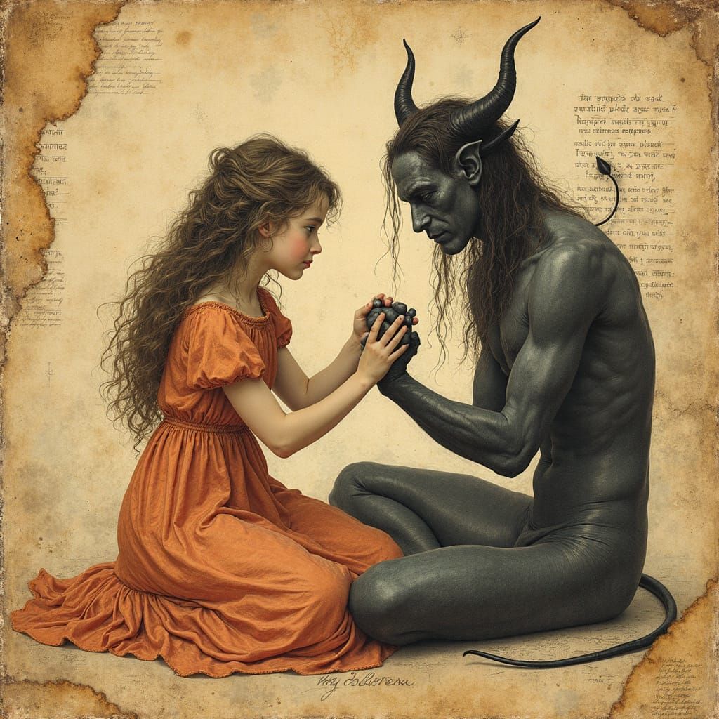 This image is a captivating, dreamy depiction of a young girl gently combing a young male devil with long hair, set against a distressed, centuries-old parchment background. Intricate details and vivid colors evoke a sense of wonder and enchantment.