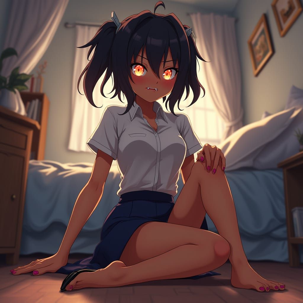 A striking picture of a tanned anime girl with black hair and glowing eyes, dressed in a business shirt and skirt. Dynamic lighting and a shallow depth of field enhance this image.